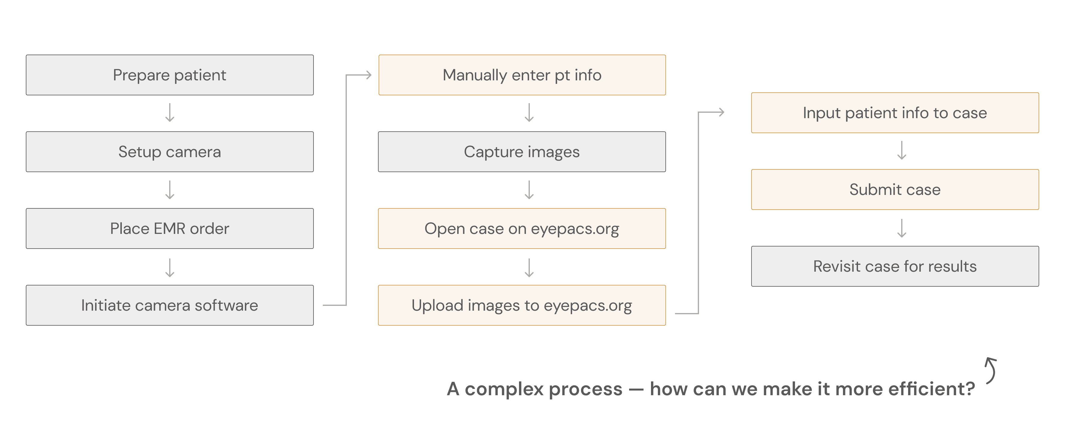 The EyePACS system requires users to take many steps to complete a single diabetic retinopathy screening. Pictured below is the steps that a retinal photographer must take in order to fully complete just one patient screening: